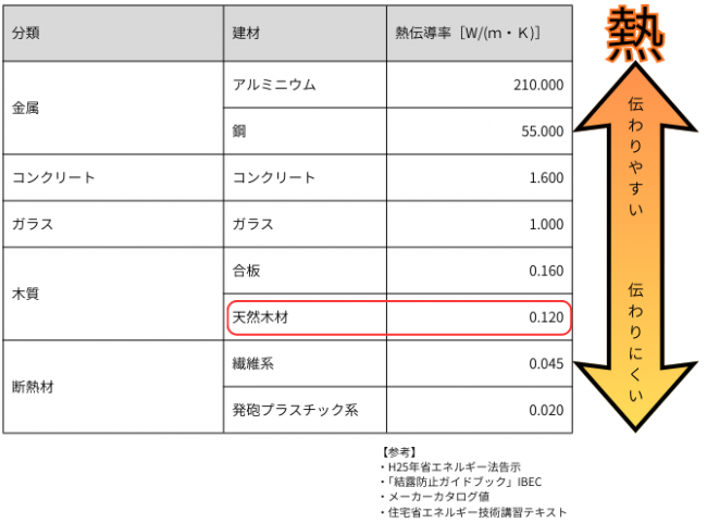 木はほかの素材に比べて熱を伝えにくいという性質があります。