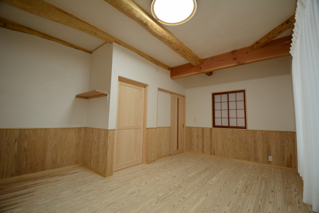 ▲無垢フロアの洋室 壁・天井仕上げは珊瑚の塗り壁です